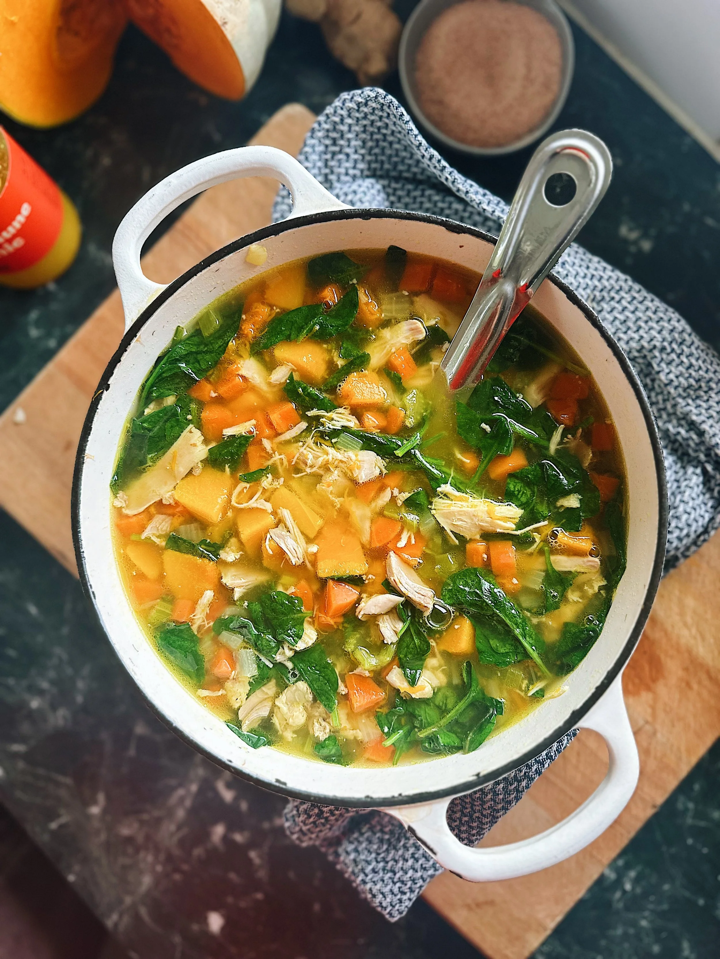 Pull the cooled chicken off the bones and add it back to the soup. Stir in the spinach, letting it wilt for about 30 seconds. Turn off the heat and, if desired, add the immune tonic for extra flavour and immune-boosting benefits.