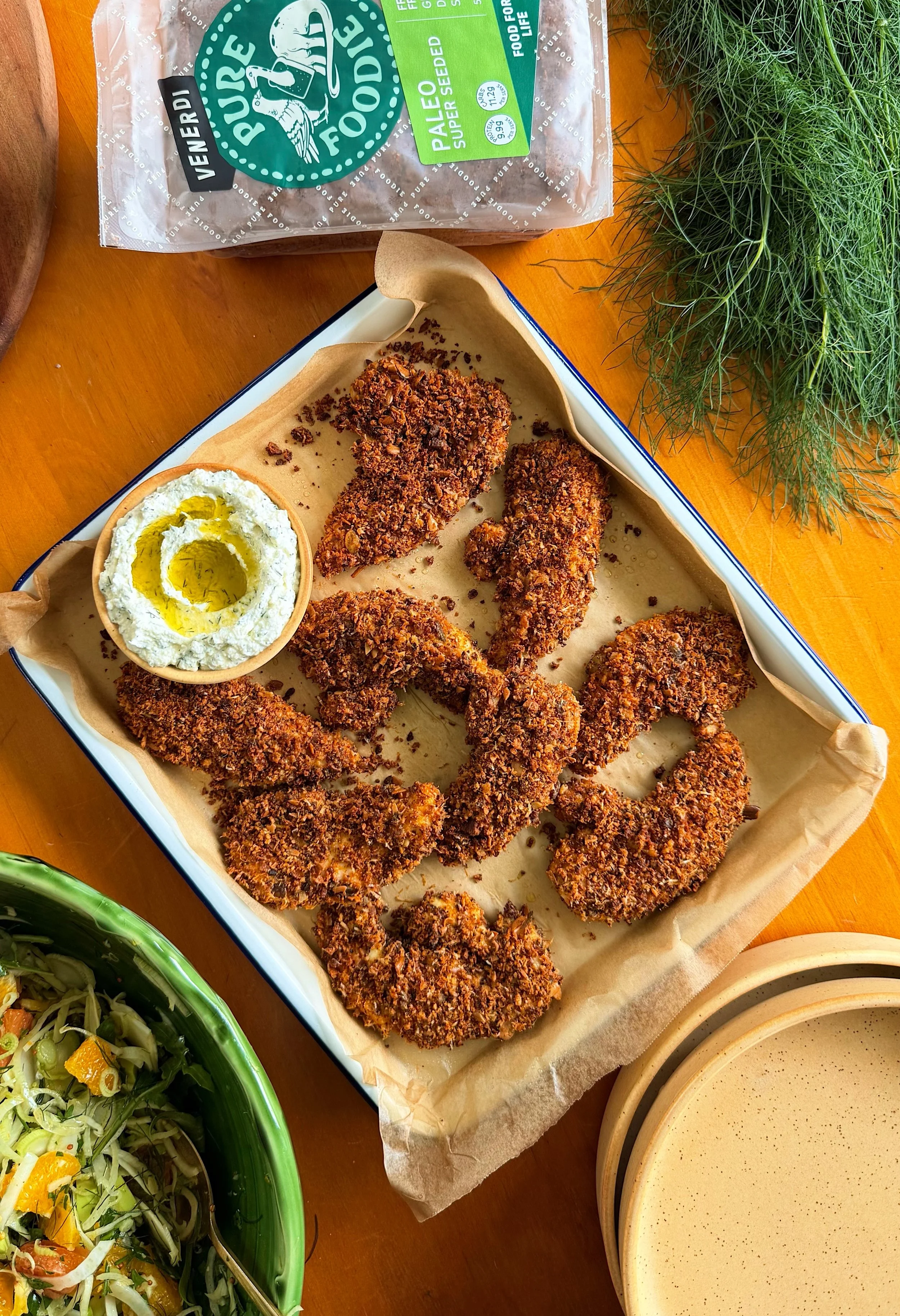 I’m already obsessed with this Venerdi pure foodie paleo super-seeded bread for my morning toast with eggs… but it also happens to make the best crunchy, seedy crumb for chicken. I used to blitz together all sorts of seeds, nuts and breadcrumbs which meant a million ingredients and extra steps — now I just blitz this, bake it off and use it as my crumbs. Honestly, so tasty and SO easy.