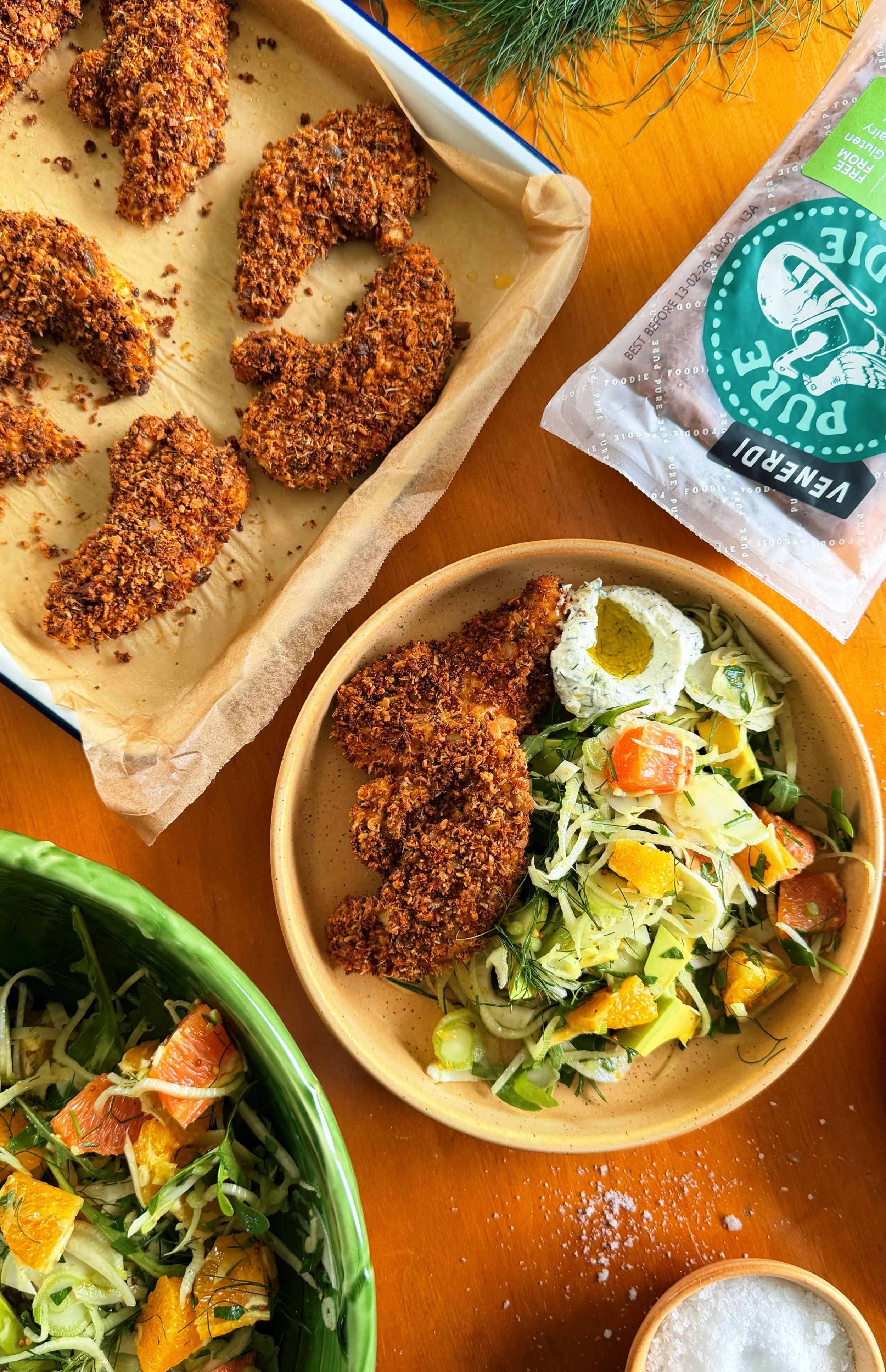 Pure Paleo Super Seeded Gluten-Free Chicken with Citrus Fennel Salad & Herby Whipped Feta